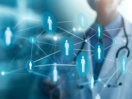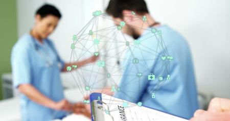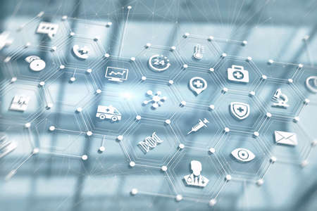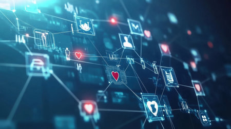 Explore a futuristic display of healthcare data connections with digital icons that represent various aspects of patient care and innovative medical technology.