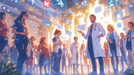 A diverse team of healthcare professionals in a modern hospital environment, surrounded by digital medical icons and technology, symbolizing innovation and collaborative care. Perfect for medical and health industry visuals.