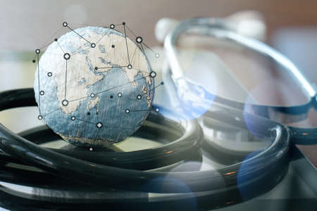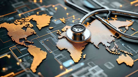 The artwork illustrates a world map integrated with digital technology, featuring a stethoscope to symbolize global healthcare advancements.