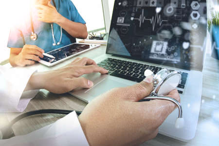 Medicine doctor hand working with modern computer and digital pro tablet with his team with digital medical diagram on wooden desk as medical concept