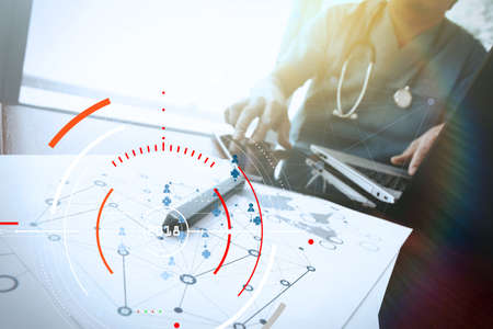 Health care and medical technology services concept with flat line AR interface.doctor working with laptop computer in medical workspace office and medical network media diagram as concept