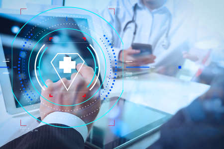 Health care and medical services with circular AR diagram.top view of Medicine doctor hand working with modern computer and digital pro tablet with blank screen with his team on wooden desk as medical concept