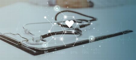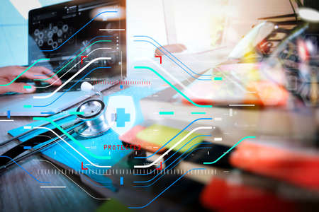 Accurate diagnosis appropriate treatment medical concept.Doctor hand working with stethoscope and laptop computer digital tablet with virtual dashboard interface