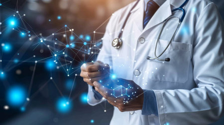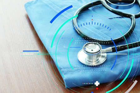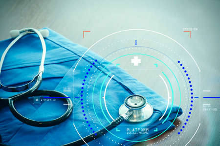 Medical technology is advancing with the use of a stethoscope on a futuristic interface, representing innovation in healthcare