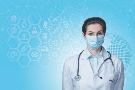 Doctor in a mask stands against the backdrop of medical icons and a blue background.