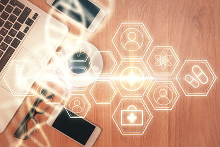 top view of Medicine doctor hand working with modern computer and digital tablet with digital medical diagram on wooden desk as medical concept