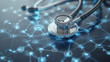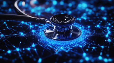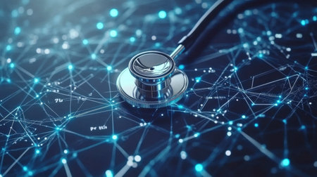 A stethoscope rests on a digital network background, symbolizing the intersection of healthcare and technology, highlighting modern innovations in medical diagnostics and patient care.