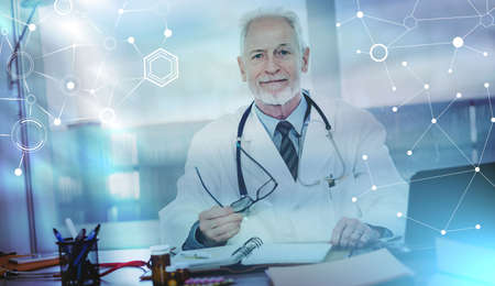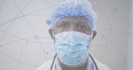 Facing camera doctor posing in clinic room, wearing mask, lab coat, stethoscope, data overlay. Healthcare, hospital, professional, senior, portrait, network, minimalist