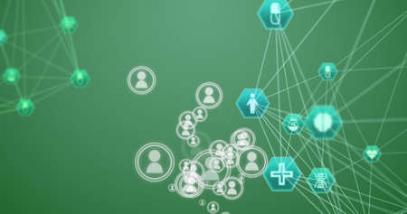 Image of network of connections with icons over stethoscope. Global medicine, connections, computing and data processing concept digitally generated image.