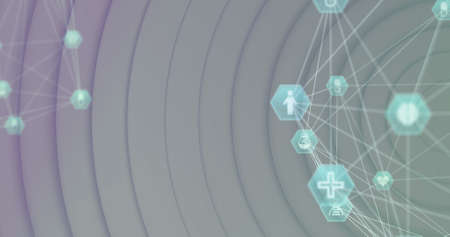 Image of network of connecting icons over moving white circles in background. Global digital network technology concept digitally generated image.