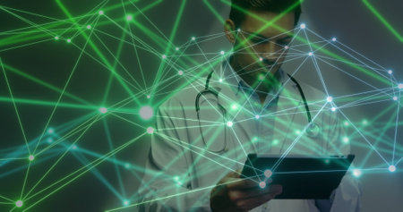 Image of data and network of connections over caucasian male doctor using tablet. Global medicine, networks, digital interface, computing and data processing concept digitally generated image.