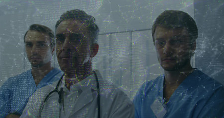 Gesturing doctor in coat leading discussion in hospital corridor, with stethoscope, network overlay. Medical, health, collaboration, teamwork, digital, technology, professional