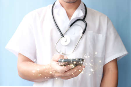 Doctor using mobile smart phone and stethoscope on blue background, closeup