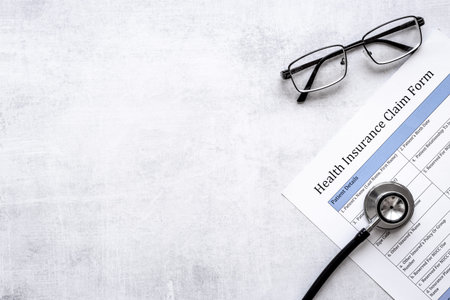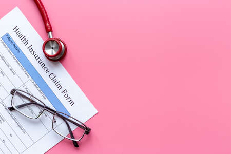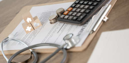 Stethoscope and calculator placed on health insurance documents, Individual medical health insurance. Concept life planning