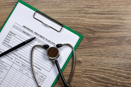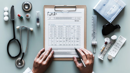 A well-organized medical examination table featuring a patient's chart, stethoscope, and various healthcare tools, capturing the essence of clinical practice and patient care.