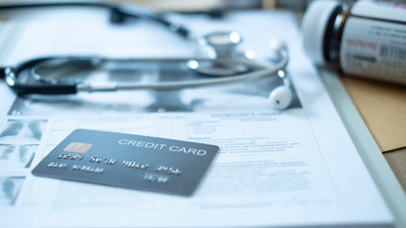A gray credit card placed on medical documents with a stethoscope and medicine bottles in the background.