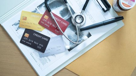 Variety of credit cards on hospital documents and stethoscope, highlighting healthcare payments.