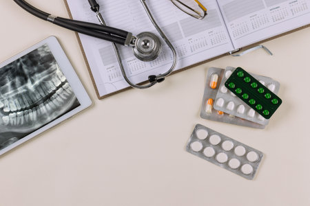 Medicall office workplace with a stethoscope with medical table CT scan of the patient X-ray image sheet for use in patient diagnosis