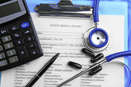 Medical and healthcare concept. Close up image of a medical history form, medical tablets or pills and a doctors stethoscope with glasses