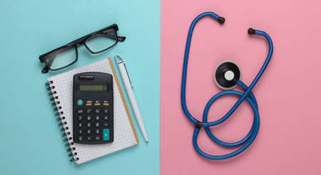 flat lay medical composition. Economic analysis. Calculator with notepad, stethoscope on a blue-pink pastel background. Top view