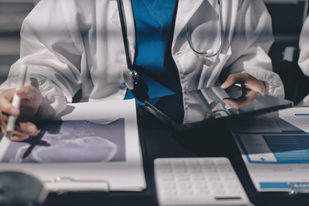 Professional medical team examining hand x-ray image. Rheumatoid arthritis.