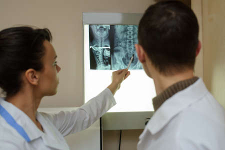Back view: picture of two doctors exploring spinal x-ray: lumbar and cervical region - first 2 cervical vertebrae (axis and atlas), coxofemural joint