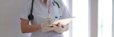 Side view of female doctor writing patient chart on digital tablet in examination room