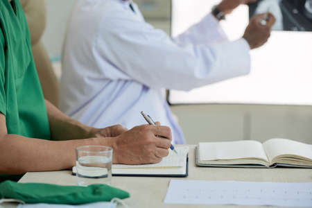 Close-up of female doctor making notes at table with x-ray image. African American general practitioner sitting at table and holding radiological picture. Pulmonology concept