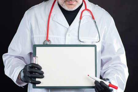 Medical concept. Doctor with a placard with a space for text. A man in a white coat with a stethoscope holds a blank sheet of paper in front of him. Black-white-red medical concept.