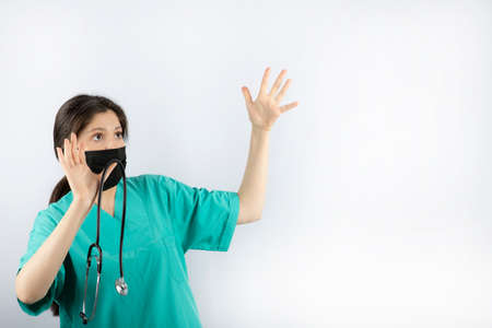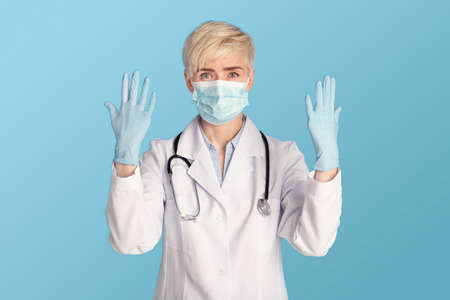 Epidemic covid-19 and medical worker save patient life. Serious adult lady surgeon in protective mask in white coat with stethoscope holds hands up in rubber gloves, isolated on light blue background