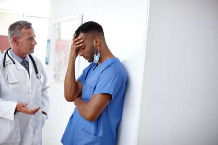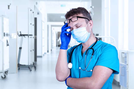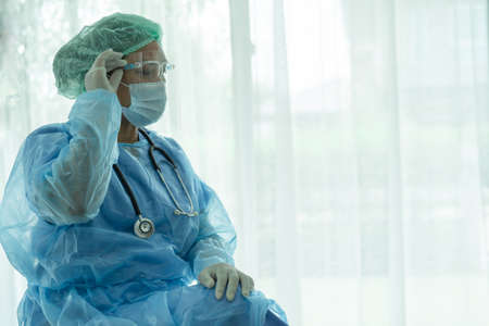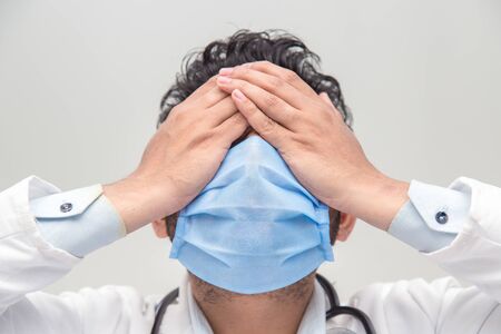 COVID-19. Exhausted Doctor looking worried as the coronavirus infected cases and death tolls rises. Emotional stressed of health workers needing support, Personal Protective gear and medical supplies.