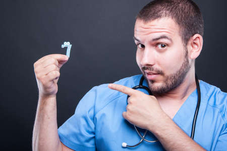 Happy young Asian man doctor, medical professional is smiling and pointing at a copy space isolated over blue background