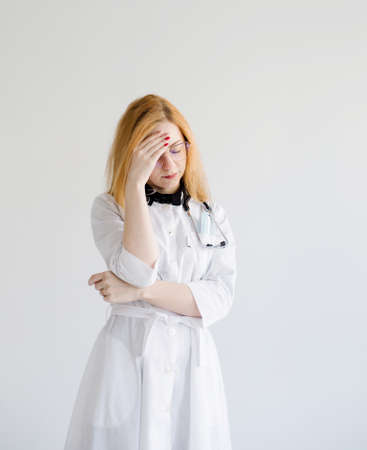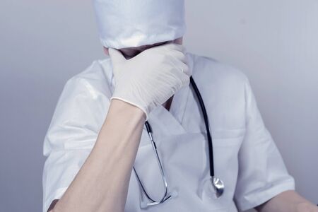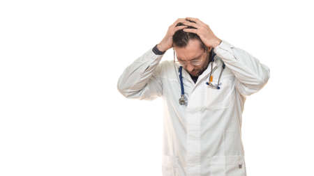 Desperate doctor holds his head up with hand. Concept of stress and failure at work. isolated on white.