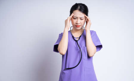 Image of a female doctor, medical staff, wincing from discomfort, suffering from headache, migraine, feeling dizzy, standing on a white background