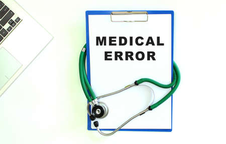 The text MEDICAL ERROR is written in a notebook that lies next to the stethoscope, medicine on a blue background. Medical concept