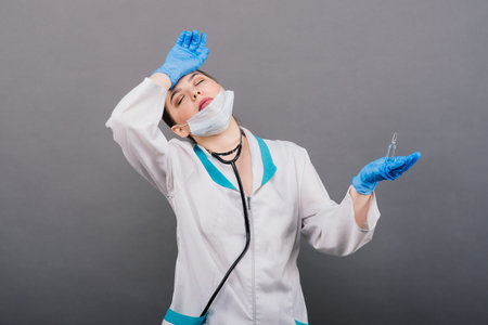 Coronavirus pandemic . Tired exhausted doctor, nurse after long shift fighting against Coronavirus (2019-nCoV) at hospital clinic taking off her mask. Global pandemic outbreak Coronavirus -CoVid-19