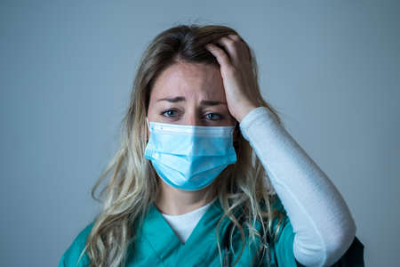 Portrait of sad and overwhelmed doctor or nurse wearing protective face mask, looking exhausted depressed and worried due to coronavirus outbreak. Emotional stressed, health care workers and COVID-19.