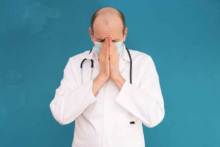 tired doctor in a mask and weighs a stethoscope on his shoulders holds his hands in front of his face, blue background