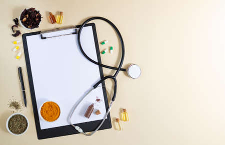 Blank clipboard with stethoscope, various healthy herbs, spices, capsules and oils top view