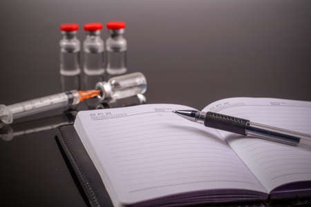 Syringes, ampoules and notebook on a black background