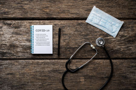 Covid 19 epidemy prevention rules, like wahing hands, written in note pad with stethoscope and medical protective mask next to it.