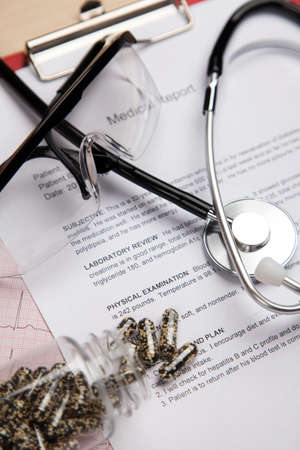 Medical stethoscope, clipboard, coat and pills, close-up