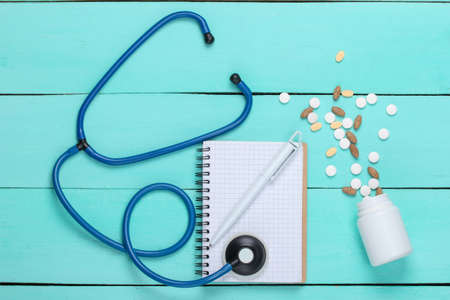 Bottle of pills with notebook, stethoscope on blue wooden background.