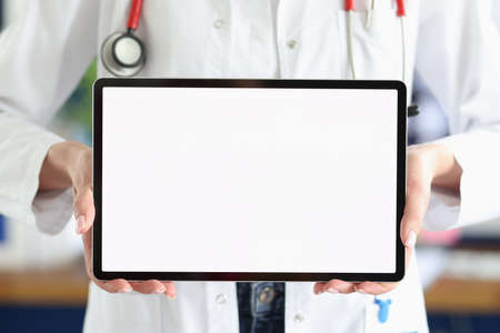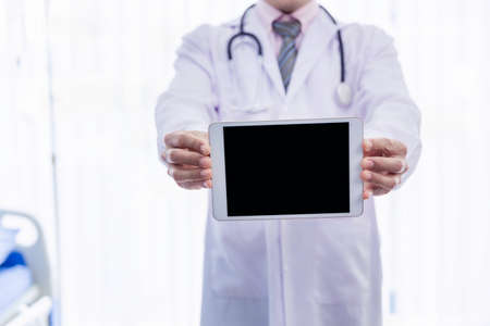 Virtual doctor concept, The patient holds a tablet. Consult and receive advice and analysis health from doctor online on virtual interface. Virtual hospital and online therapy.