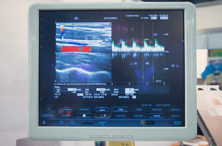 Close up of advanced medical monitor displaying ultrasound images in a professional operating room