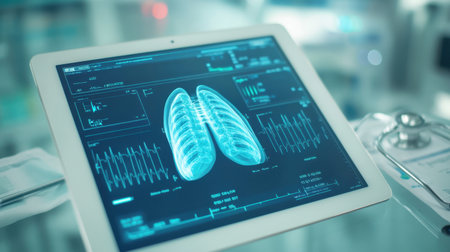 Modern tablet displaying human lung images with health data, perfect for illustrating respiratory research and healthcare diagnostics in a clinical environment.