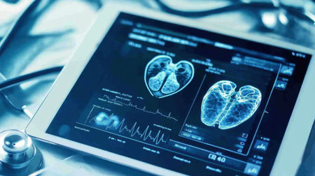 Explore a modern medical tablet featuring heart scans and vital signs, showcasing innovative technology enhancing patient care in a healthcare setting.