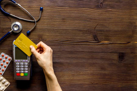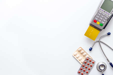 Healthcare insurance concept - payment terminal with a bank card, top view