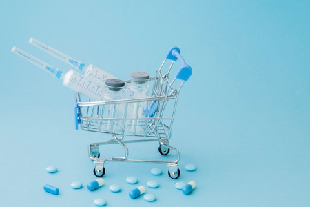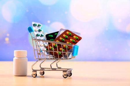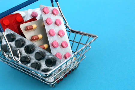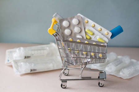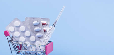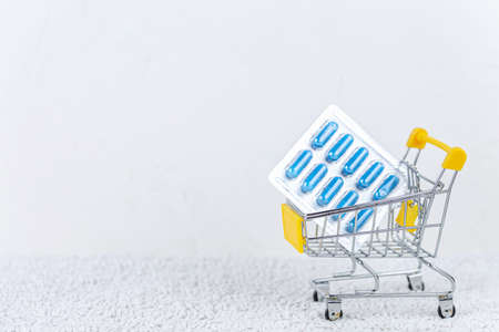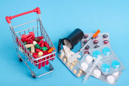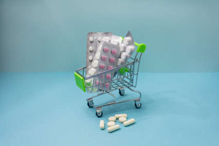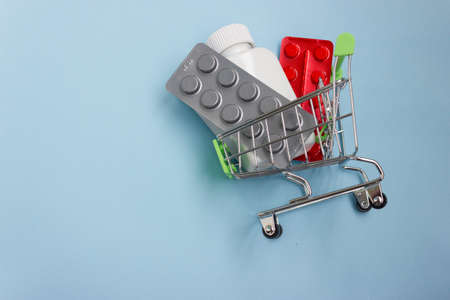 Purchase of pills and various medicines. An idea for healthcare and pharmaceutical company. Trolley with medicines on blue background close-up.