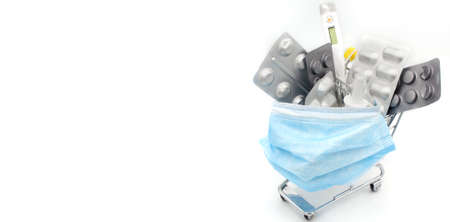 Blue shopping cart with medical mask for virus protection full of pills and medicine on white background. Creative concept of healthcare and safe online shopping in farmacy on coronavirus quarantine.